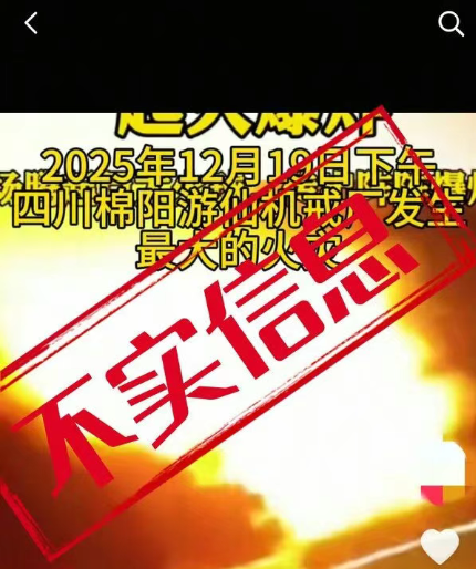 近日,有网民发布视频称四川省绵阳市“游仙区一机械厂发生火灾”,经与消防部门核实,消防部门未接到过类似火情,此消息纯属谣言。