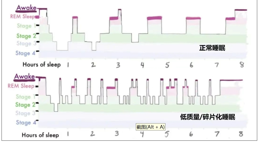 图注:低质量睡眠,哪怕睡够了8小时,睡眠相位被分割得稀碎,使人很难达到深度睡眠