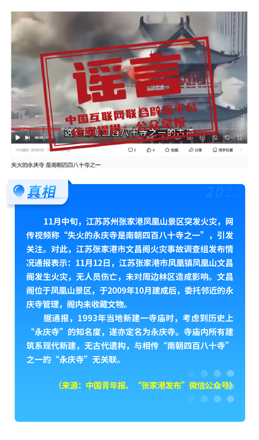 社会热点事件被歪曲蹭炒。首届“苏超”联赛泰州队夺冠后,“冠军获五十万奖金、城市地图放大字号”等谣言流传,以夸张信息博眼球、引流量;江苏张家港凤凰山景区火灾后,“‘南朝四百八十寺之一’被烧”的谣言引发热议,通报显示失火建筑为2009年新建,与历史上的南朝寺庙无关联。