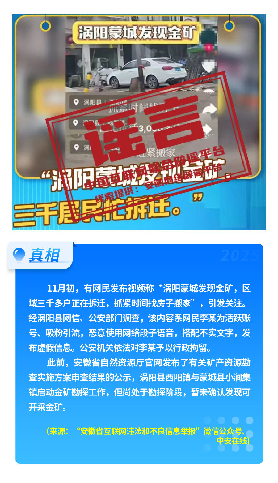 国家网信办近日会同工业和信息化部等部门深入开展汽车行业网络乱象专项整治行动,从严整治散布虚假不实信息,恶意抹黑诋毁汽车企业、汽车产品等违法违规行为,对违规账号依法依约采取处置措施。针对不法分子利用AI技术冒用公众人物形象直播带货乱象,同步开展专项行动,严厉处置一批违法违规网络账号,清理相关违规信息8700余条,处置仿冒公众人物账号1.1万余个。公安机关严厉打击造谣传谣违法行为,上述“充‘劣质电’会导致新能源汽车自燃”“安徽涡阳蒙城发现金矿,三千居民忙拆迁”“内蒙古赤峰一菜地可免费采摘白菜”等谣言制造者,均已被依法查处。
