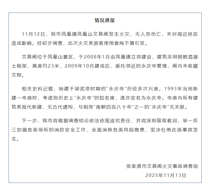 11月13日,江苏张家港市文昌阁火灾事故调查组发布情况通报: