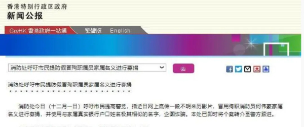 据香港特区政府新闻公报消息,12月1日,香港消防处呼吁市民提高警觉,称近日网上流传一段不明来历视频,冒用殉职消防员何伟豪家属名义进行募捐,并使用与家属真实银行户口姓名极其相似的名字,企图诈骗。目前,消防处已实时将个案转至警方跟进。