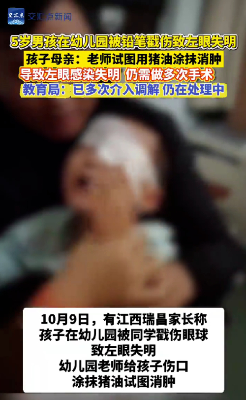 男孩被铅笔戳伤后形成眼球穿通伤,老师没有及时送医且用猪油涂抹伤口是完全错误的,不但延误治疗时机而且增加感染风险。