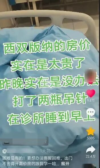 “困难是有的!要想办法克服困难,出门不舍得开高价房的,跟我学一下!”2月20日,一位网民在社交平台发视频称,西双版纳的房价太贵了,前一晚(19日)实在没办法去打了两瓶吊针,在诊所睡到了早上。视频中还附有给诊所的付款截图。该视频引发关注,两天时间获近10万点赞,20余万次转发。